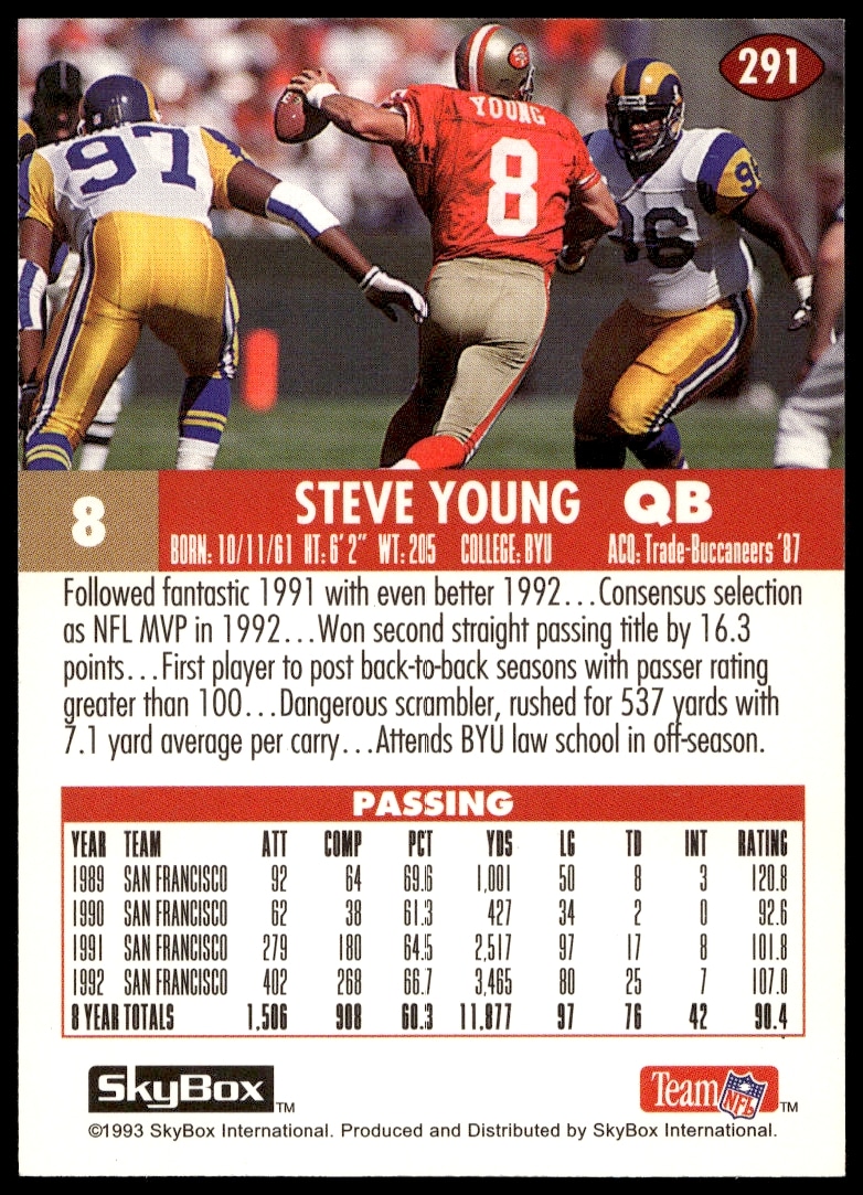 This Football card, from 1993 is part of the SkyBox Impact card set. Steve Young is featured and has a card number of 291.