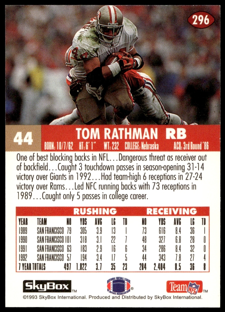 This FootballΒ card, from 1993 is part of the SkyBox ImpactΒ card set. Tom Rathman is featured and has a card number of 296.