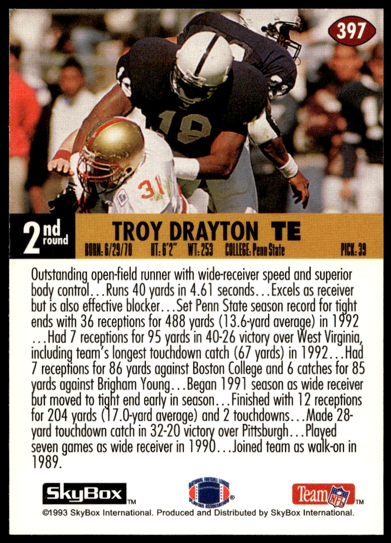 This FootballΒ card, from 1993 is part of the SkyBox ImpactΒ card set. Troy Drayton is featured and has a card number of 397.