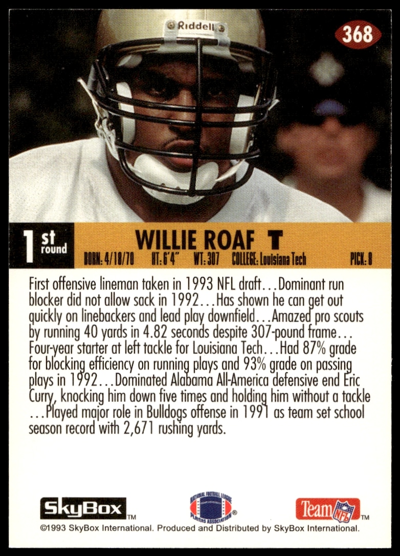 This FootballΒ card, from 1993 is part of the SkyBox ImpactΒ card set. Willie Roaf is featured and has a card number of 368.