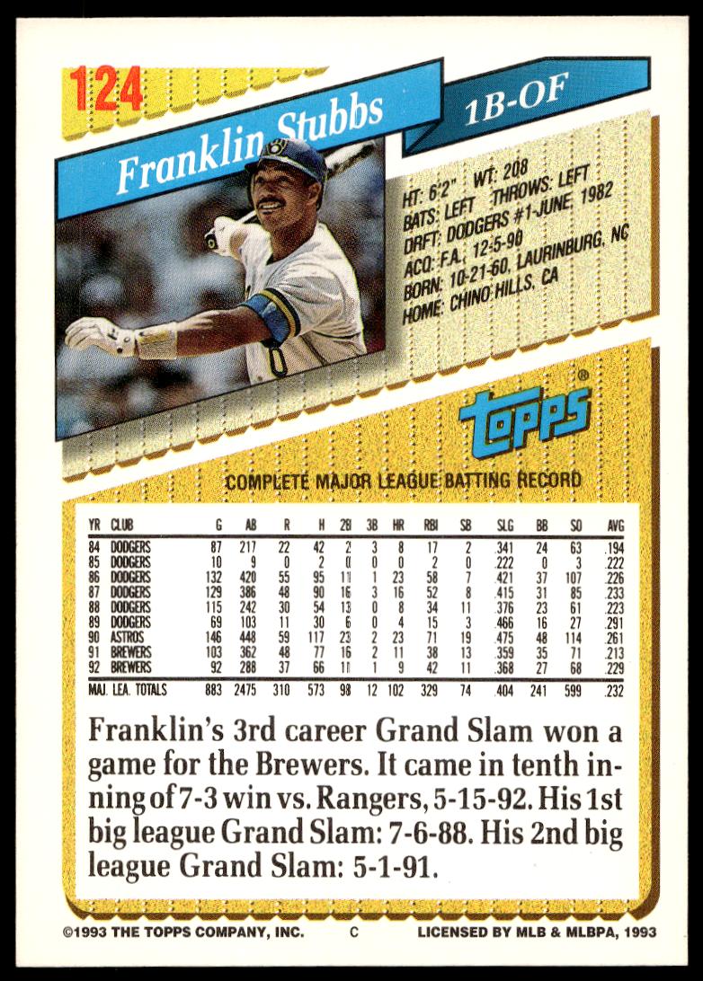 This Baseball card, from 1993 is part of the Topps Series 1 card set. Franklin Stubbs is featured and has a card number of 124.