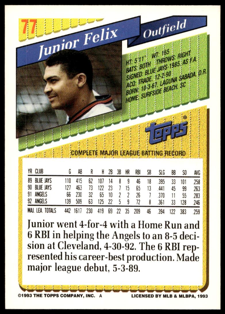 This BaseballΒ card, from 1993 is part of the Topps Series 1Β card set. Junior Felix is featured and has a card number of 77.