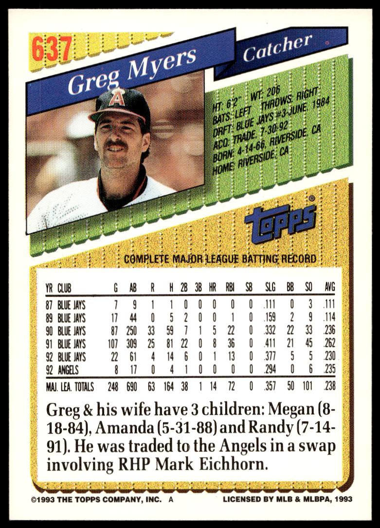This BaseballΒ card, from 1993 is part of the Topps Series 2Β card set. Greg Myers is featured and has a card number of 637.