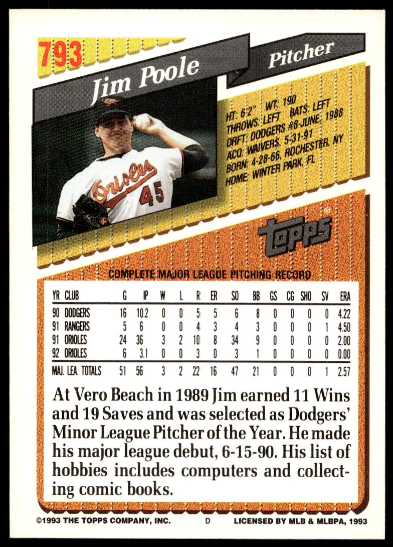This BaseballΒ card, from 1993 is part of the Topps Series 2Β card set. Jim Poole is featured and has a card number of 793.