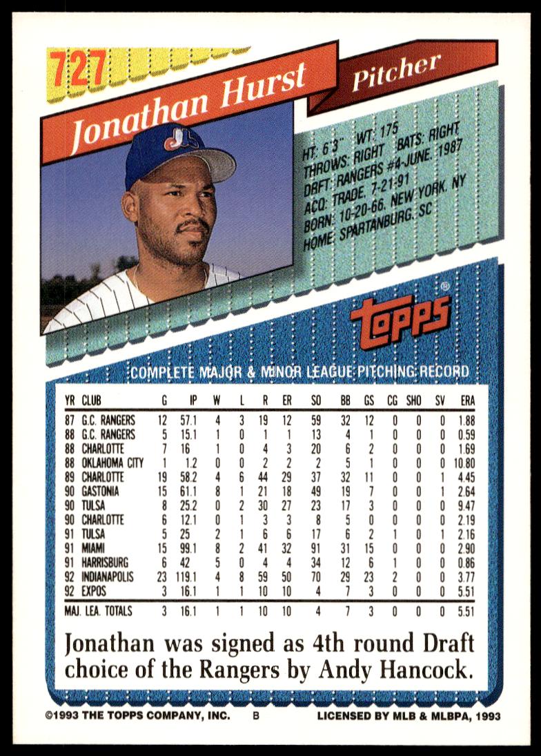 This BaseballΒ card, from 1993 is part of the Topps Series 2Β card set. Jonathan Hurst is featured and has a card number of 727.