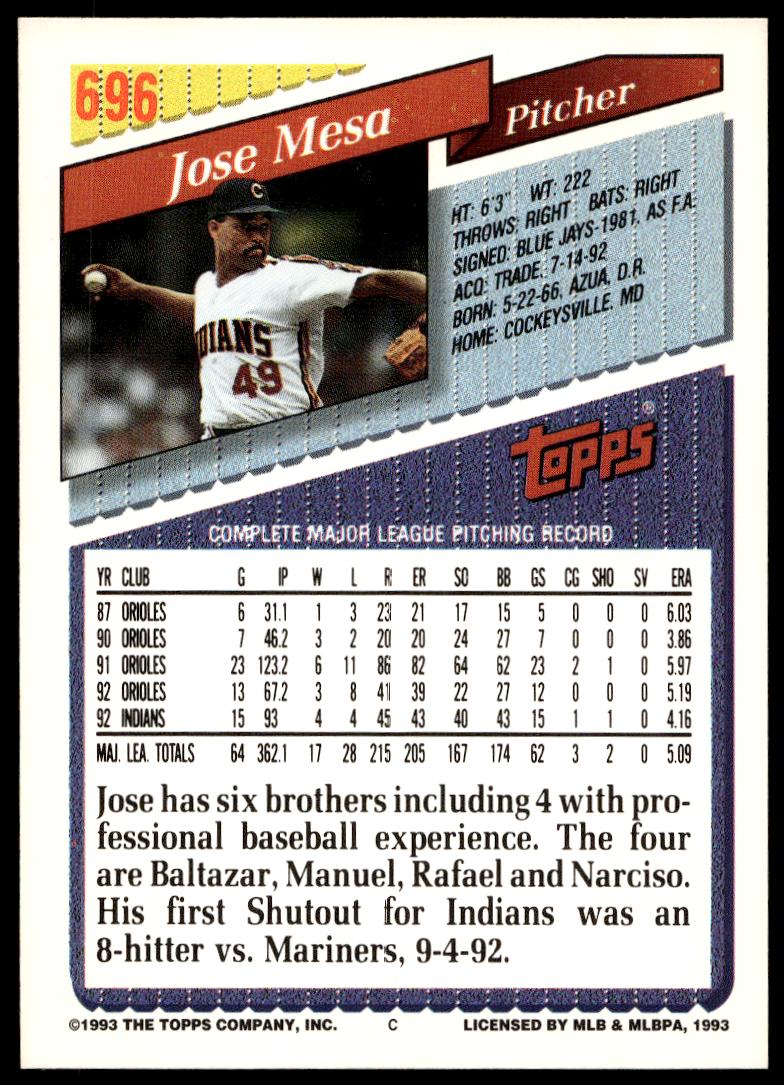 This BaseballΒ card, from 1993 is part of the Topps Series 2Β card set. Jose Mesa is featured and has a card number of 696.