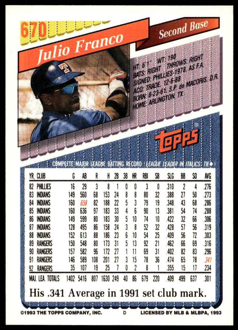 This BaseballΒ card, from 1993 is part of the Topps Series 2Β card set. Julio Franco is featured and has a card number of 670.