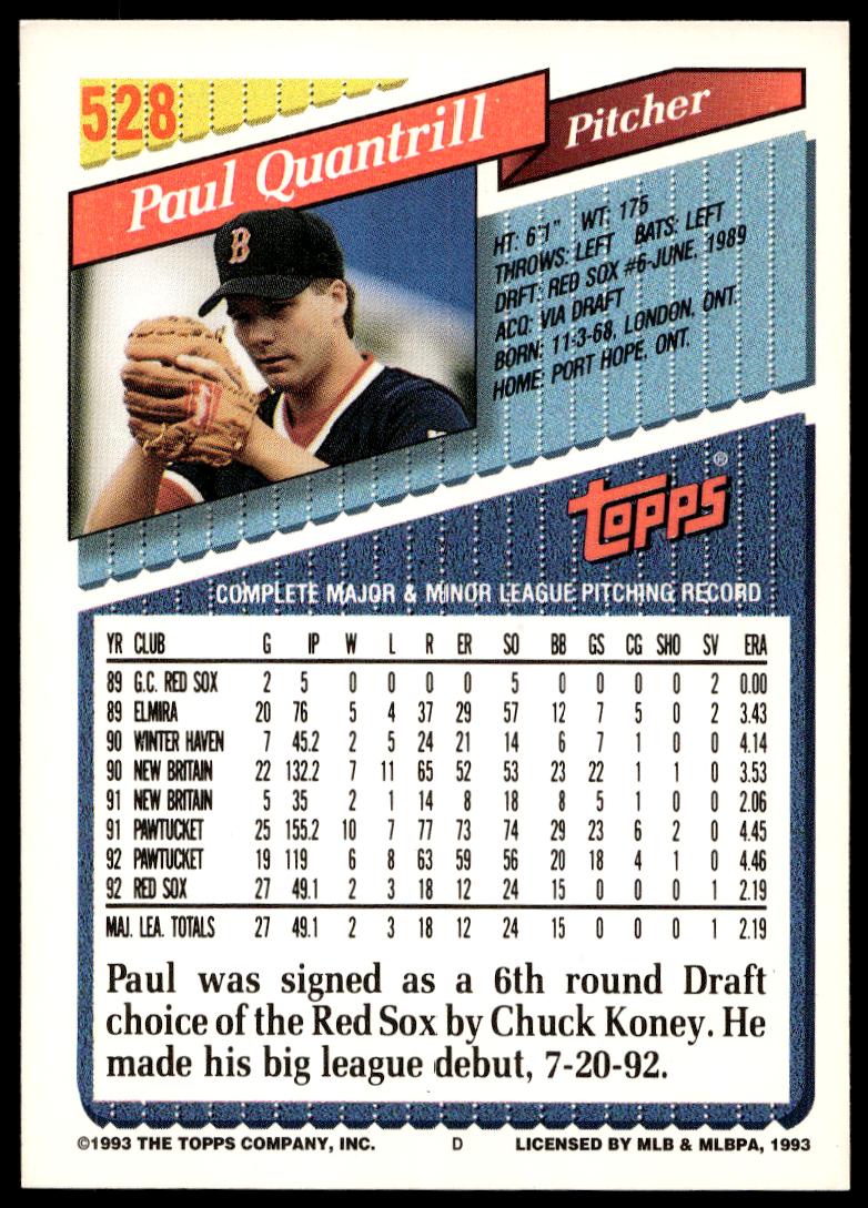 This BaseballΒ card, from 1993 is part of the Topps Series 2Β card set. Paul Quantrill is featured and has a card number of 528.