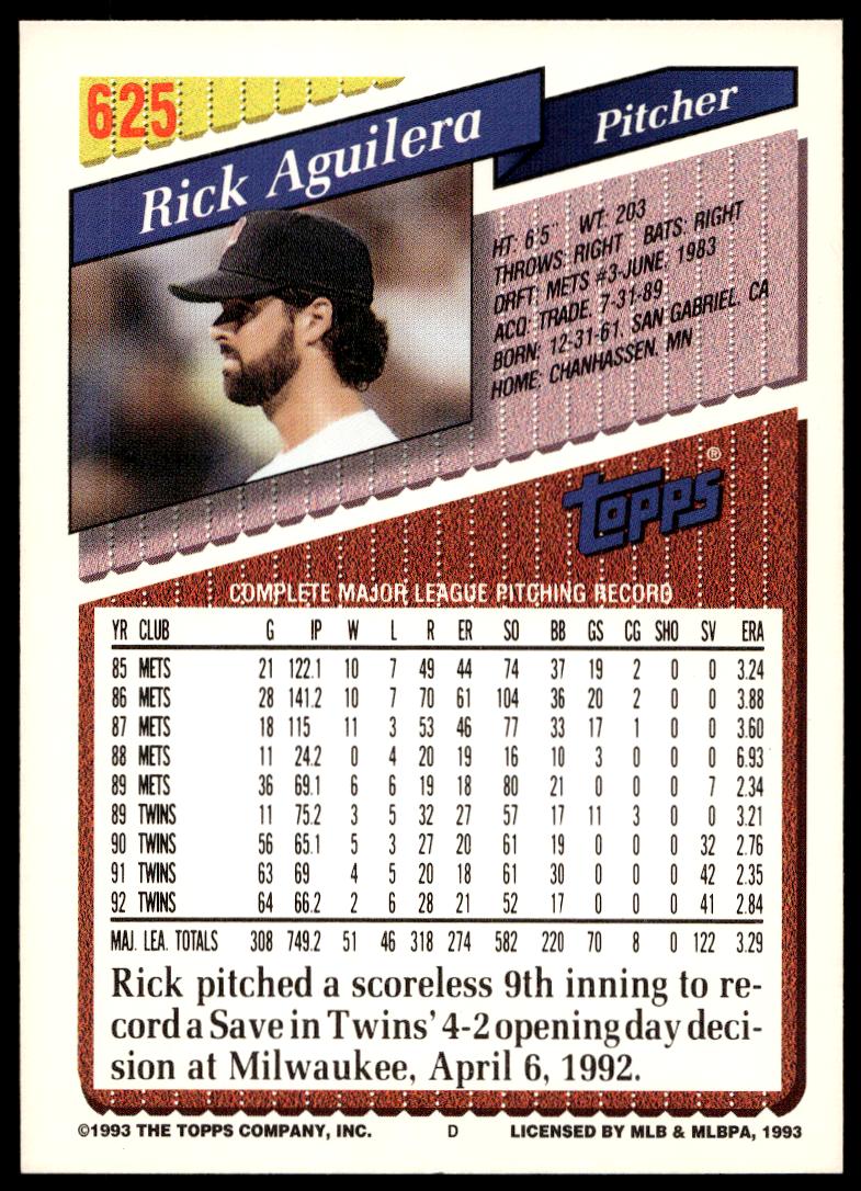 This BaseballΒ card, from 1993 is part of the Topps Series 2Β card set. Rick Aguilera is featured and has a card number of 625.
