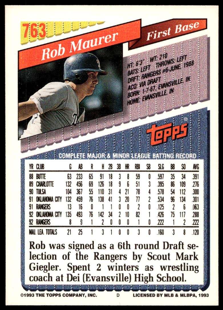 This BaseballΒ card, from 1993 is part of the Topps Series 2Β card set. Rob Maurer is featured and has a card number of 763.