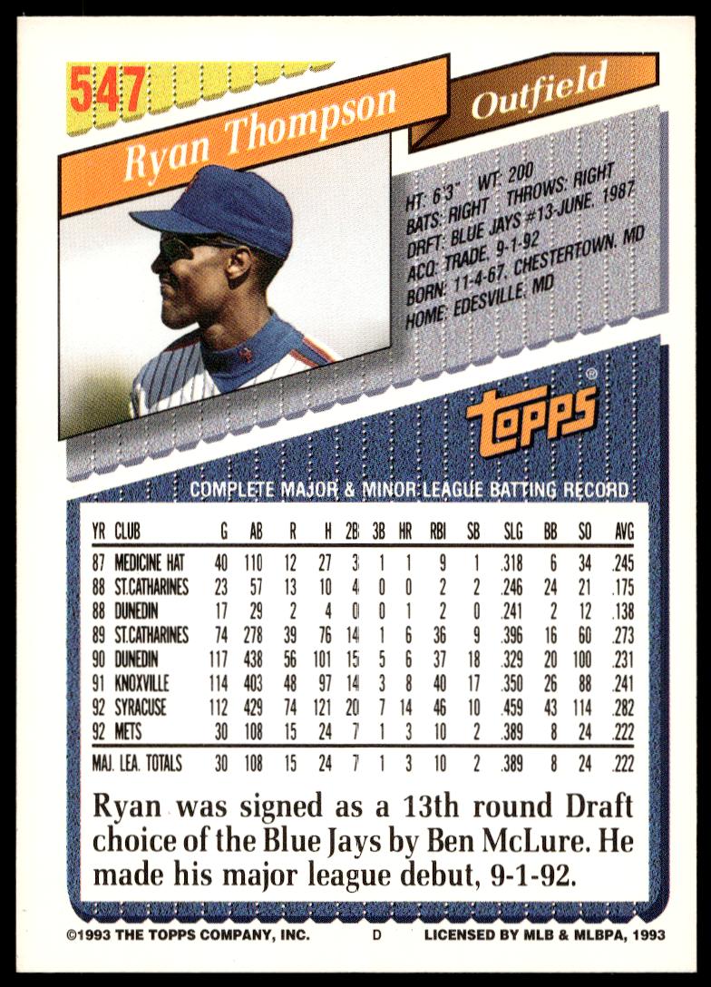 This BaseballΒ card, from 1993 is part of the Topps Series 2Β card set. Ryan Thompson is featured and has a card number of 547.