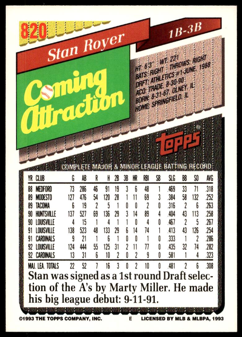 This BaseballΒ card, from 1993 is part of the Topps Series 2Β card set. Stan Royer is featured and has a card number of 820.