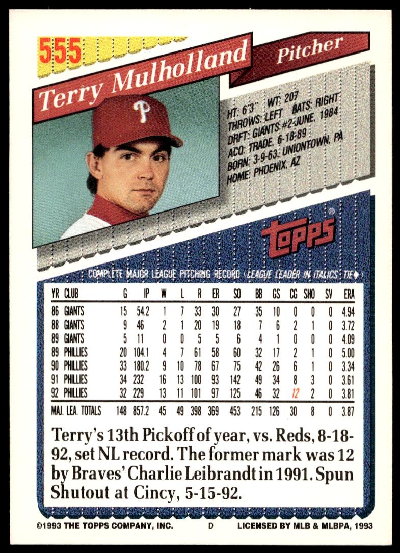 This BaseballΒ card, from 1993 is part of the Topps Series 2Β card set. Terry Mulholland is featured and has a card number of 555.