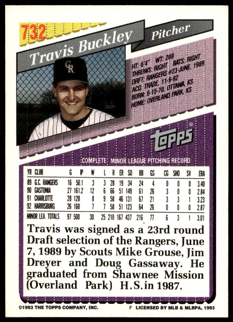 This BaseballΒ card, from 1993 is part of the Topps Series 2Β card set. Travis Buckley is featured and has a card number of 732.