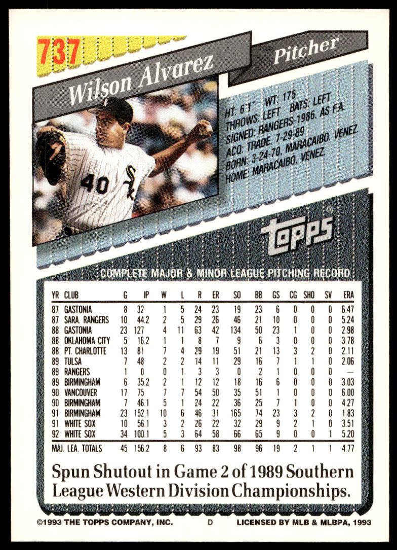This Baseball card, from 1993 is part of the Topps Series 2 card set. Wilson Alvarez is featured and has a card number of 737.