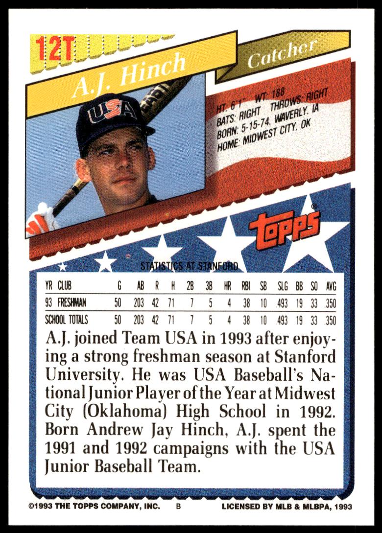 This Baseball card, from 1993 is part of the Topps Traded card set. A.J. Hinch is featured and has a card number of 12T.