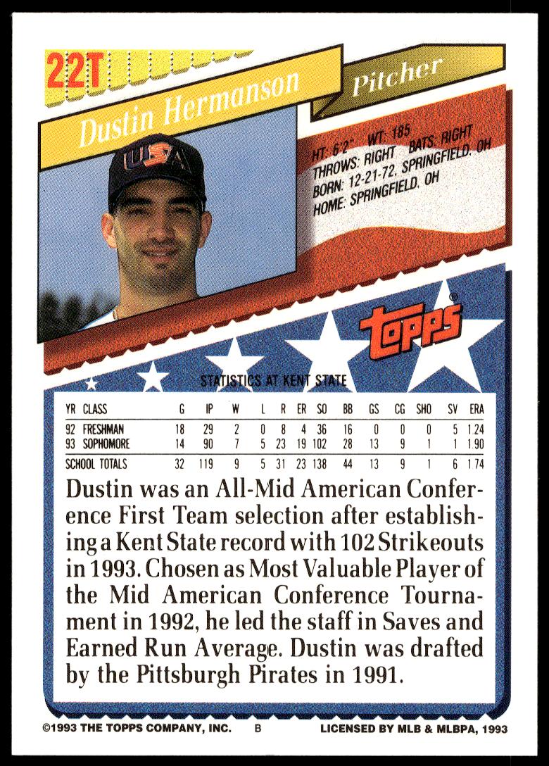 This BaseballΒ card, from 1993 is part of the Topps TradedΒ card set. Dustin Hermanson is featured and has a card number of 22T.