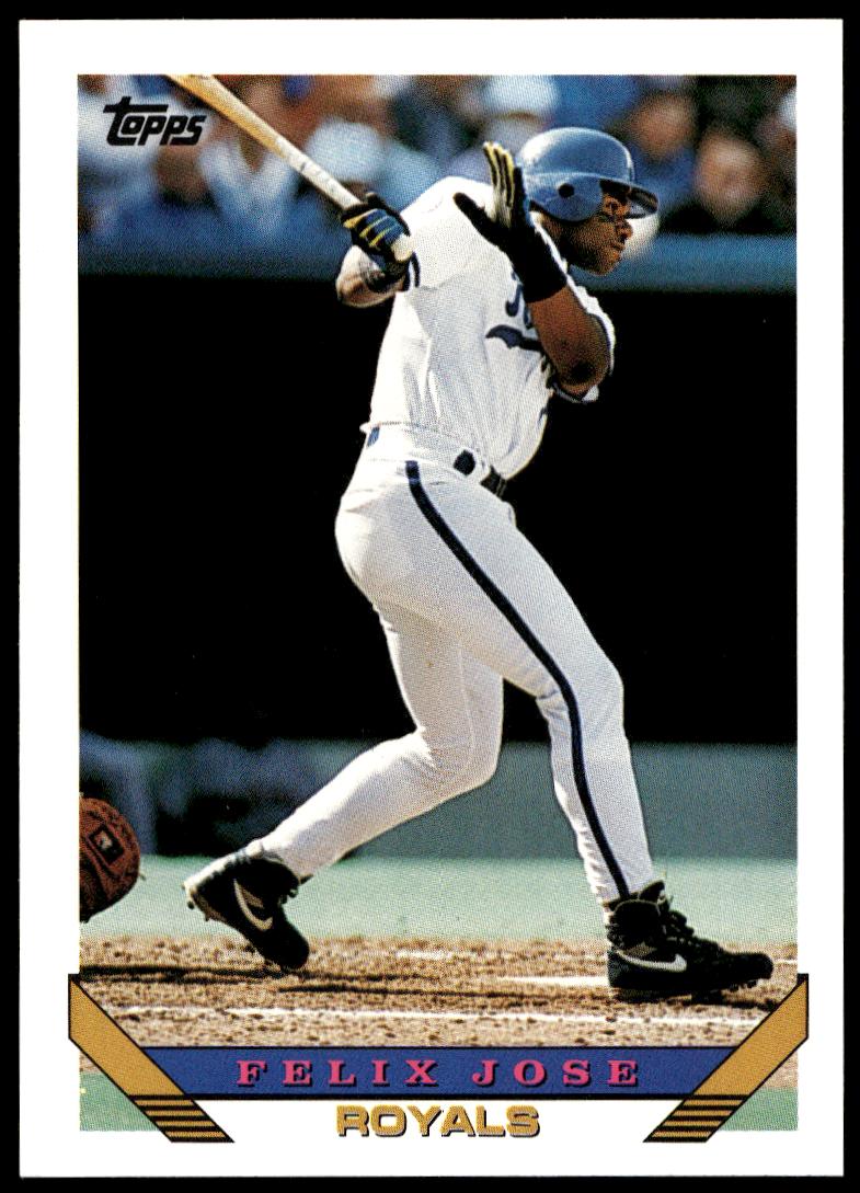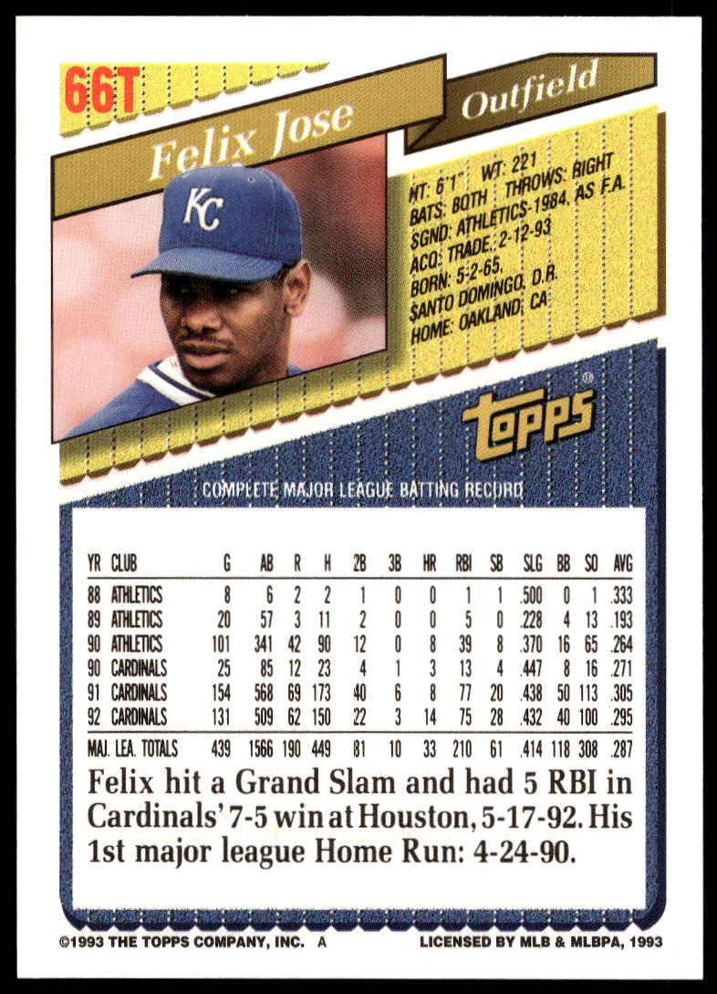 This Baseball card, from 1993 is part of the Topps Traded card set. Felix Jose is featured and has a card number of 66T.