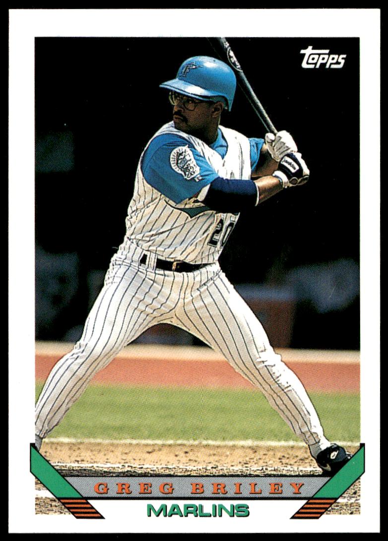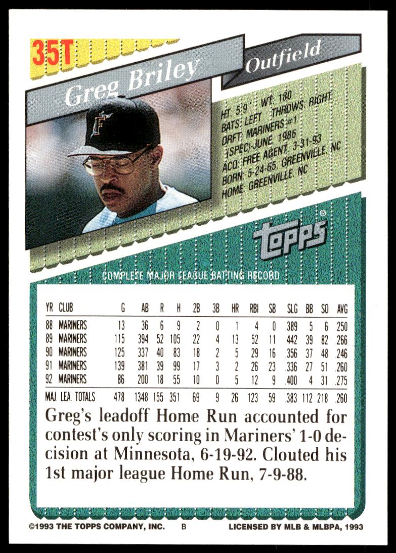 This Baseball card, from 1993 is part of the Topps Traded card set. Greg Briley is featured and has a card number of 35T.