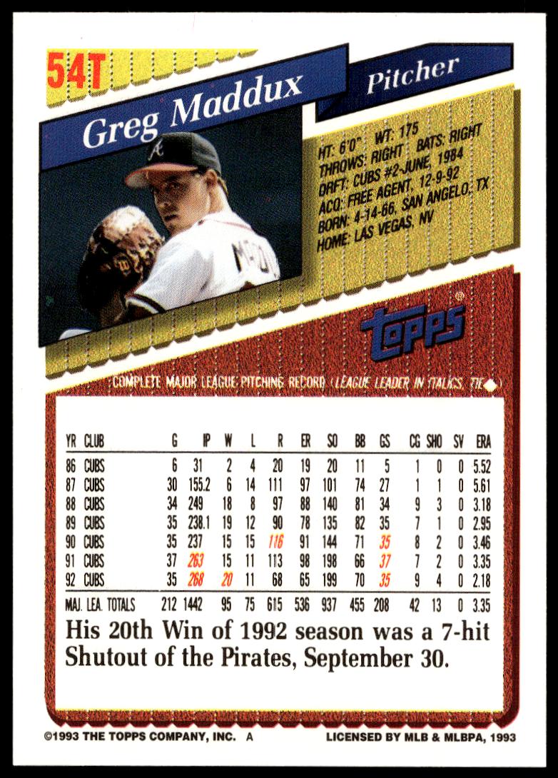 This BaseballΒ card, from 1993 is part of the Topps TradedΒ card set. Greg Maddux is featured and has a card number of 54T.