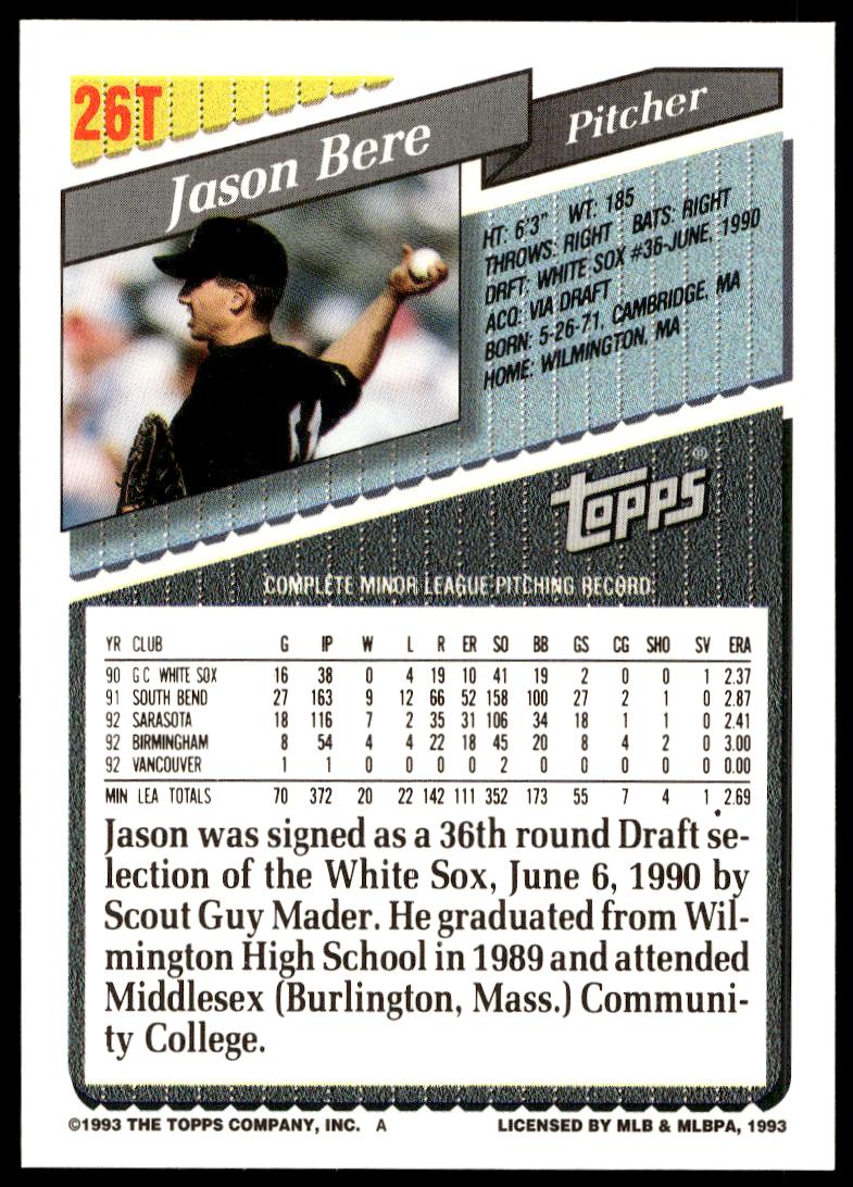 This Baseball card, from 1993 is part of the Topps Traded card set. Jason Bere is featured and has a card number of 26T.