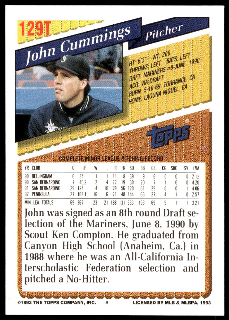 This BaseballΒ card, from 1993 is part of the Topps TradedΒ card set. John Cummings is featured and has a card number of 129T.