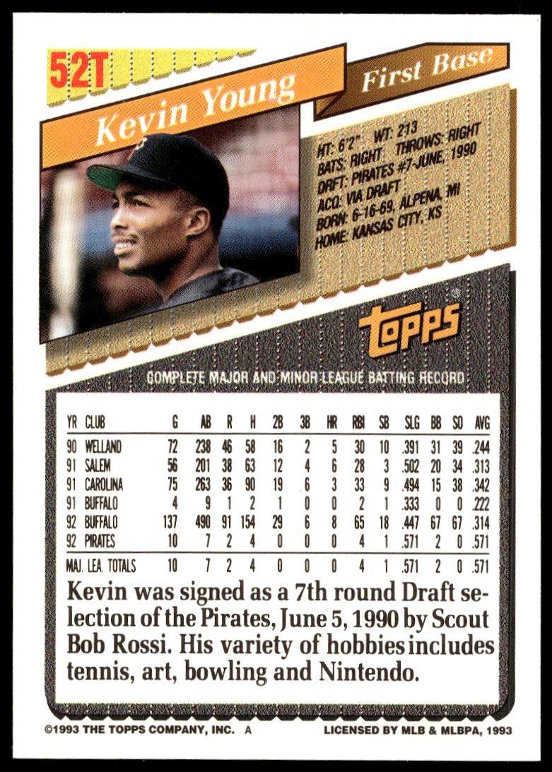 This BaseballΒ card, from 1993 is part of the Topps TradedΒ card set. Kevin Young is featured and has a card number of 52T.
