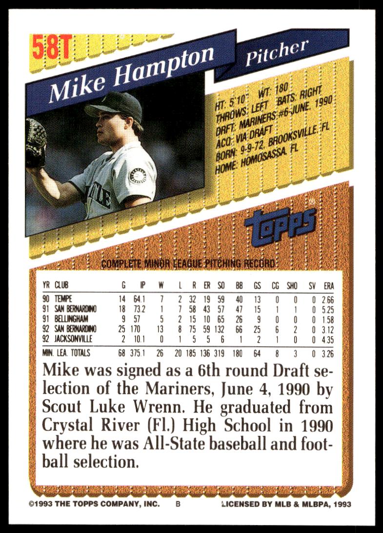 This BaseballΒ card, from 1993 is part of the Topps TradedΒ card set. Mike Hampton is featured and has a card number of 58T.