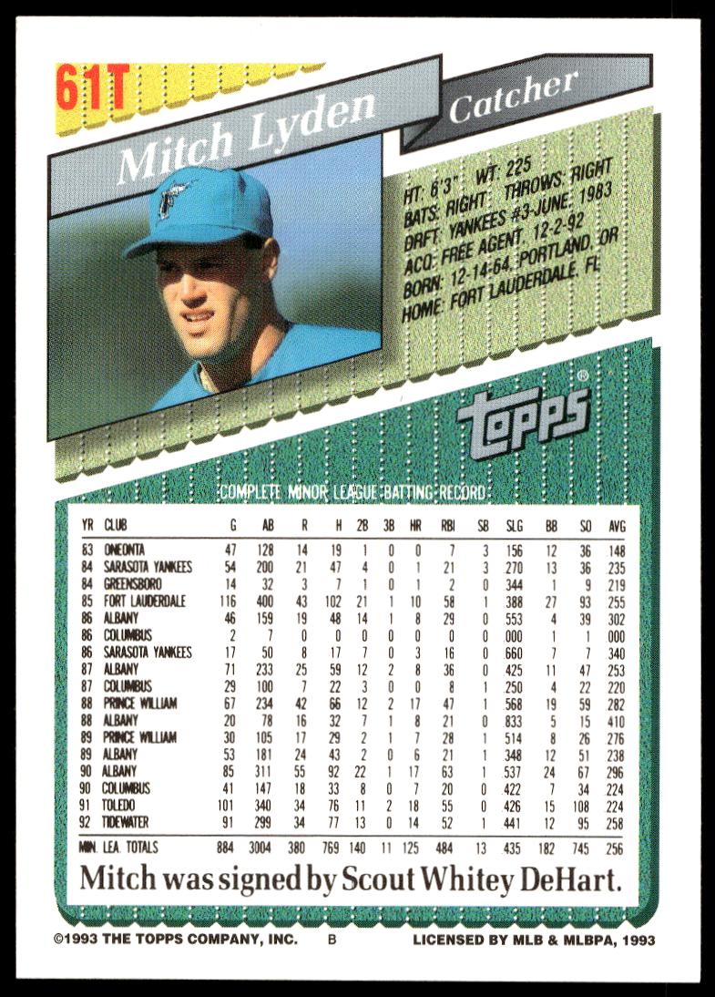 This BaseballΒ card, from 1993 is part of the Topps TradedΒ card set. Mitch Lyden is featured and has a card number of 61T.