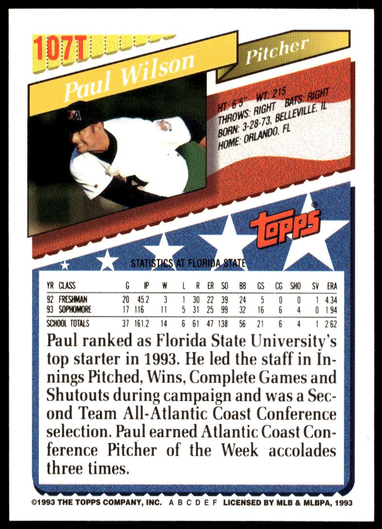 This BaseballΒ card, from 1993 is part of the Topps TradedΒ card set. Paul Wilson is featured and has a card number of 107T.