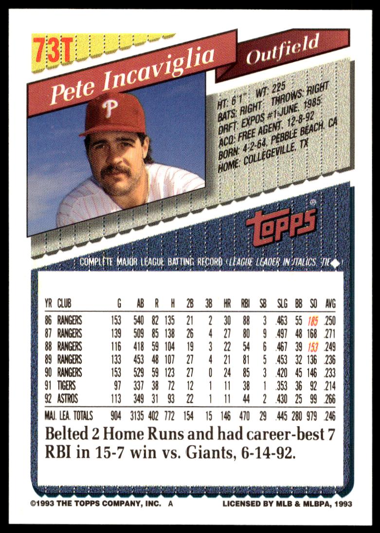 This Baseball card, from 1993 is part of the Topps Traded card set. Pete Incaviglia is featured and has a card number of 73T.