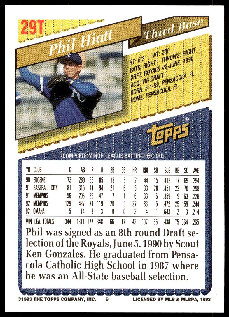 This Baseball card, from 1993 is part of the Topps Traded card set. Phil Hiatt is featured and has a card number of 29T.