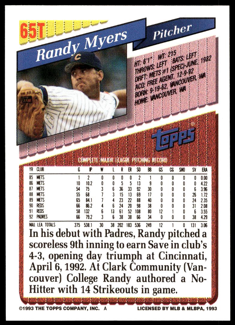 This BaseballΒ card, from 1993 is part of the Topps TradedΒ card set. Randy Myers is featured and has a card number of 65T.