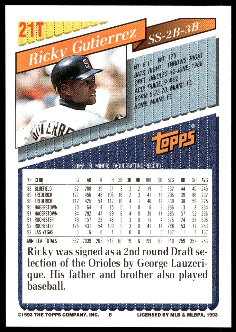 This BaseballΒ card, from 1993 is part of the Topps TradedΒ card set. Ricky Gutierrez is featured and has a card number of 21T.