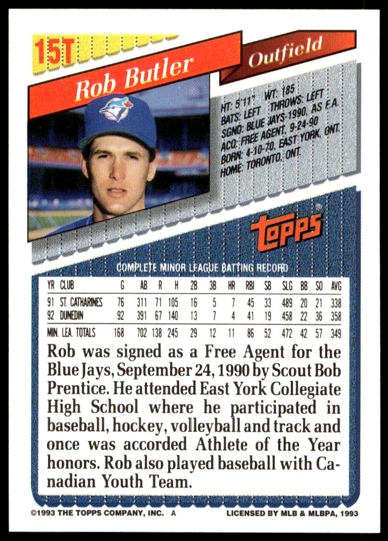 This Baseball card, from 1993 is part of the Topps Traded card set. Rob Butler is featured and has a card number of 15T.