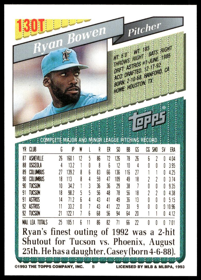 This BaseballΒ card, from 1993 is part of the Topps TradedΒ card set. Ryan Bowen is featured and has a card number of 130T.