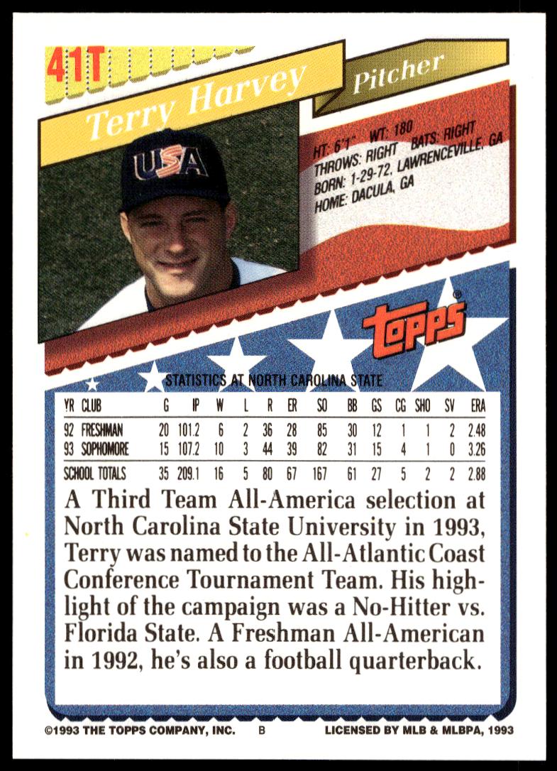 This BaseballΒ card, from 1993 is part of the Topps TradedΒ card set. Terry Harvey is featured and has a card number of 41T.