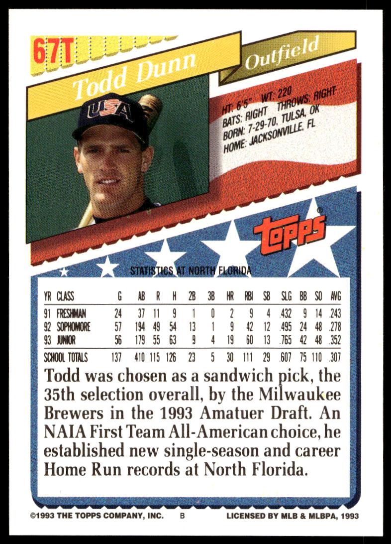 This Baseball card, from 1993 is part of the Topps Traded card set. Todd Dunn is featured and has a card number of 67T.