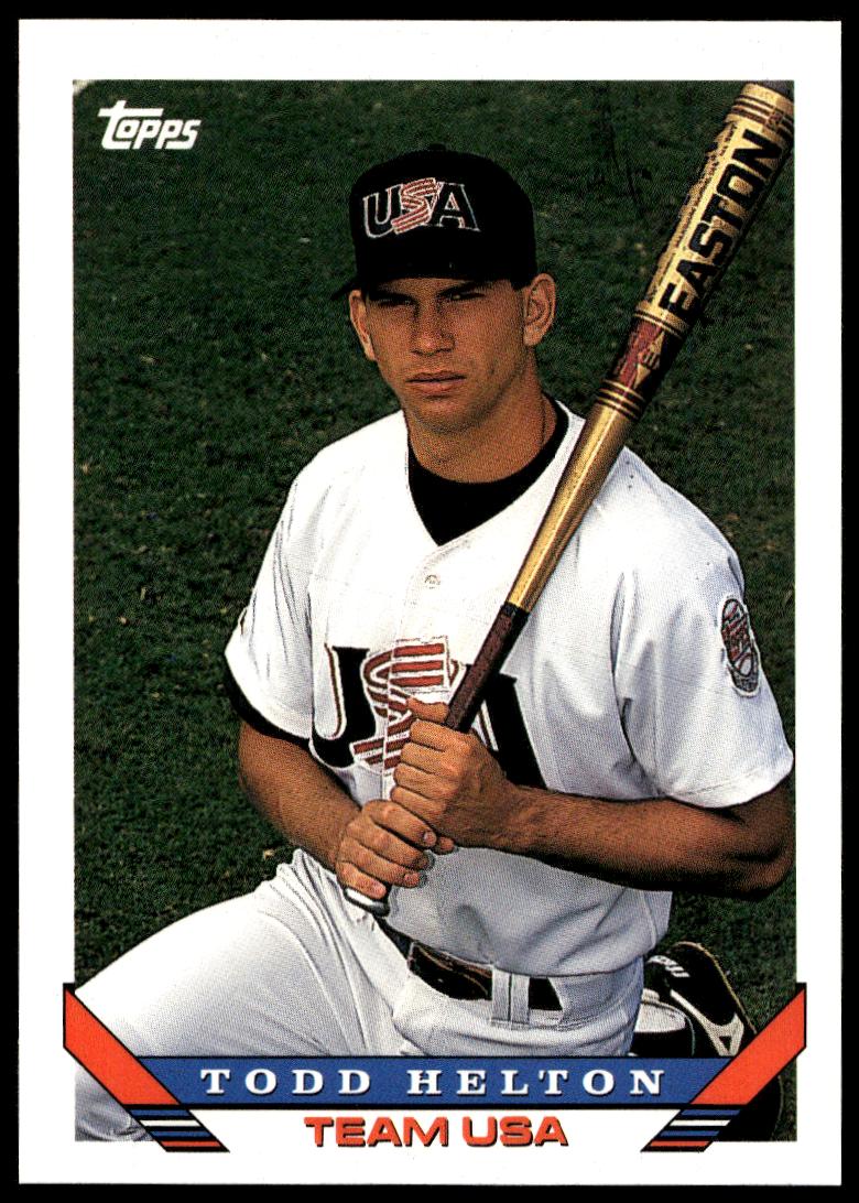This Baseball card, from 1993 is part of the Topps Traded card set. Todd Helton is featured and has a card number of 19T.