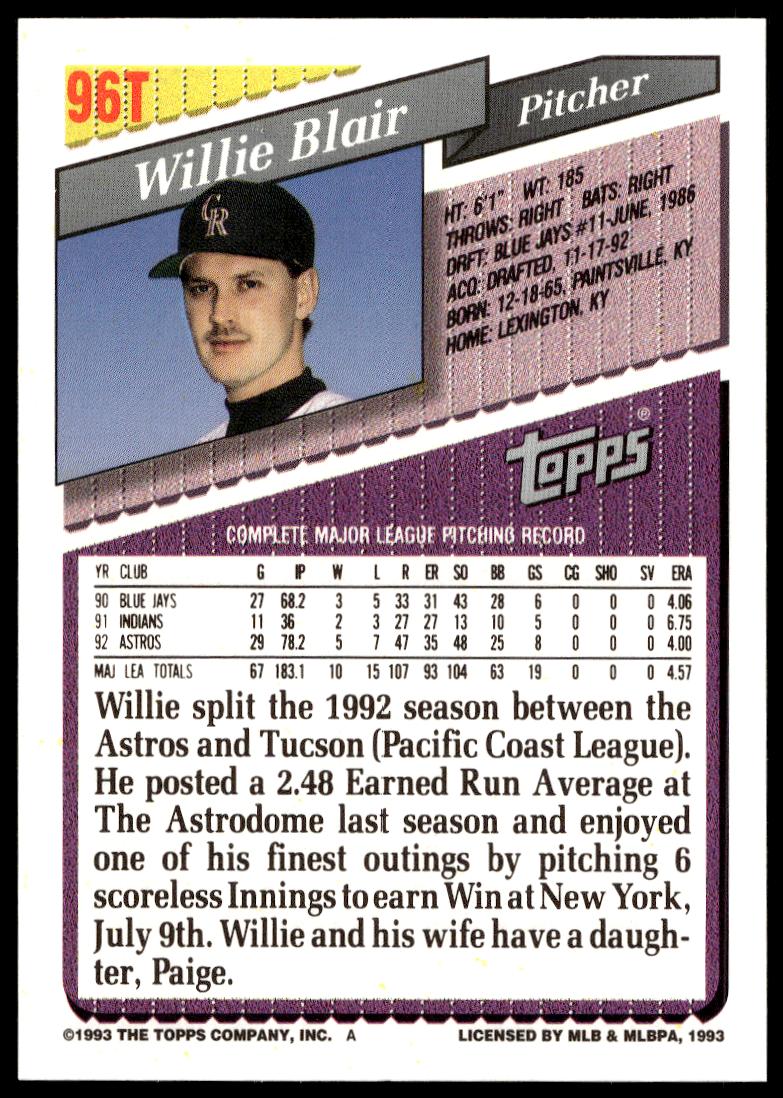 This Baseball card, from 1993 is part of the Topps Traded card set. Willie Blair is featured and has a card number of 96T.