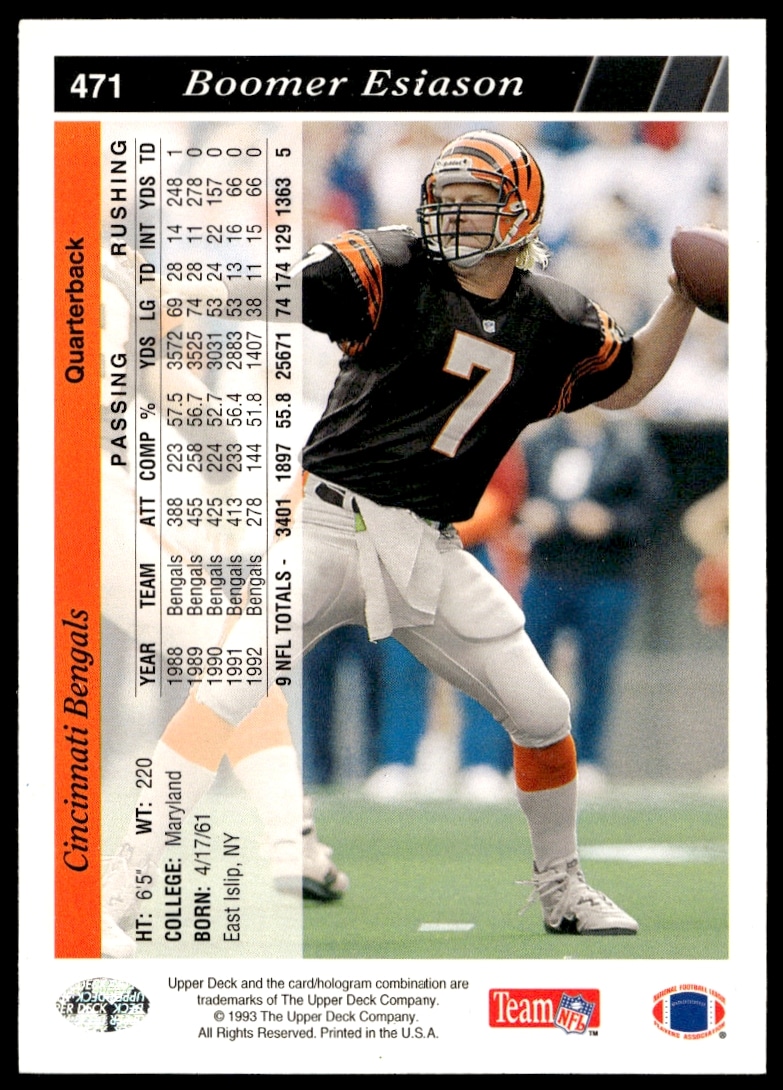 This Football card, from 1993 is part of the Upper Deck card set. Boomer Esiason is featured and has a card number of 471.