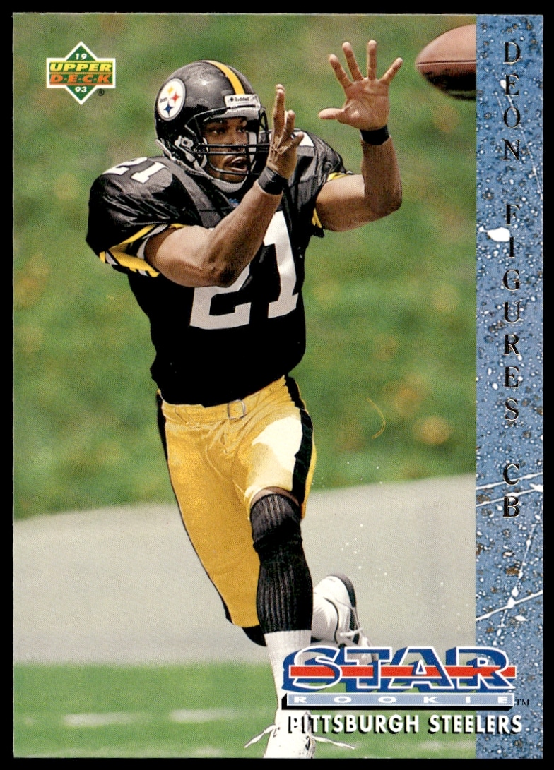 This Football card, from 1993 is part of the Upper Deck card set. Deon Figures is featured and has a card number of 21.