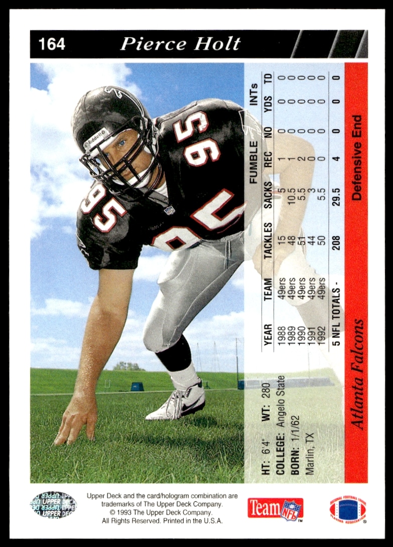 This Football card, from 1993 is part of the Upper Deck card set. Pierce Holt is featured and has a card number of 164.