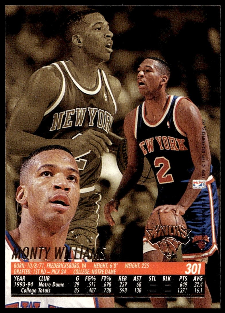 This Basketball card, from 1994-95 is part of the Fleer Ultra card set. Monty Williams is featured and has a card number of 301.