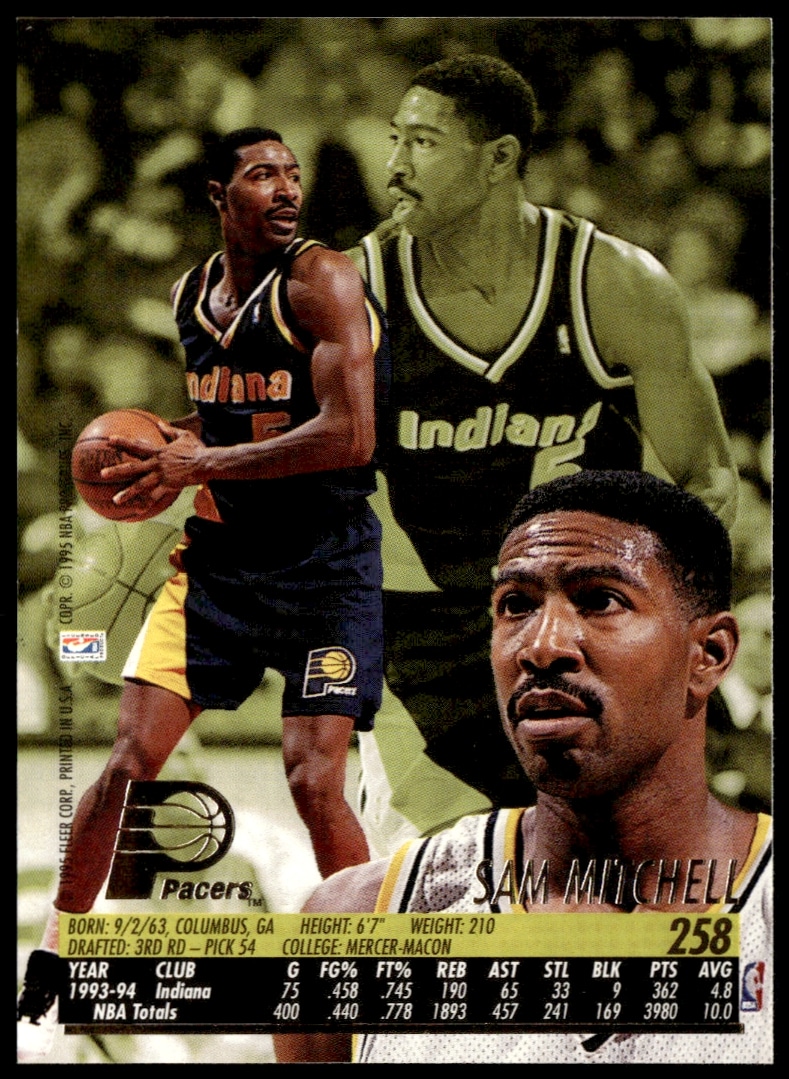 This Basketball card, from 1994-95 is part of the Fleer Ultra card set. Sam Mitchell is featured and has a card number of 258.