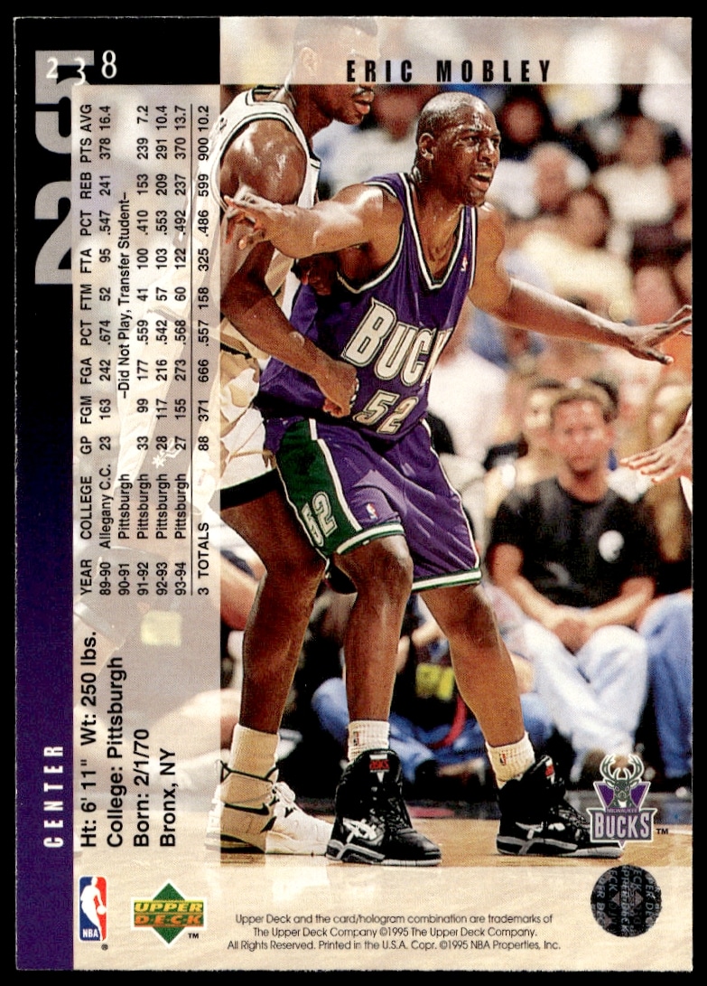 This Basketball card, from 1994-95 is part of the Upper Deck card set. Eric Mobley is featured and has a card number of 238.