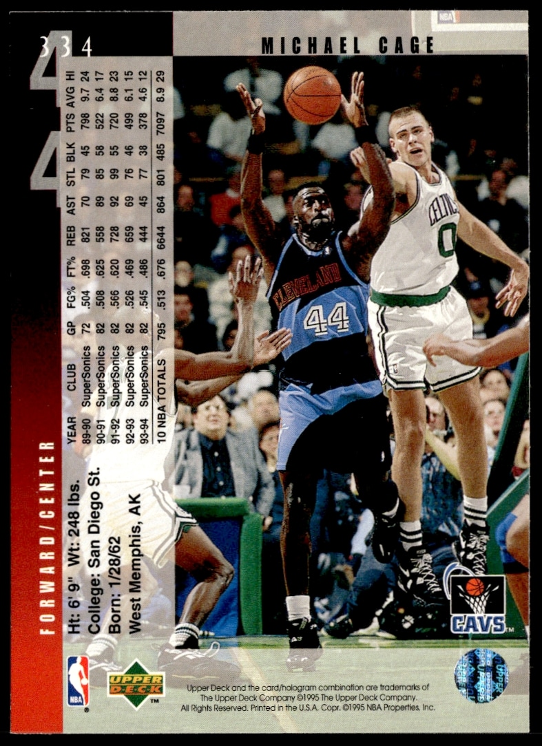 This Basketball card, from 1994-95 is part of the Upper Deck card set. Michael Cage is featured and has a card number of 334.