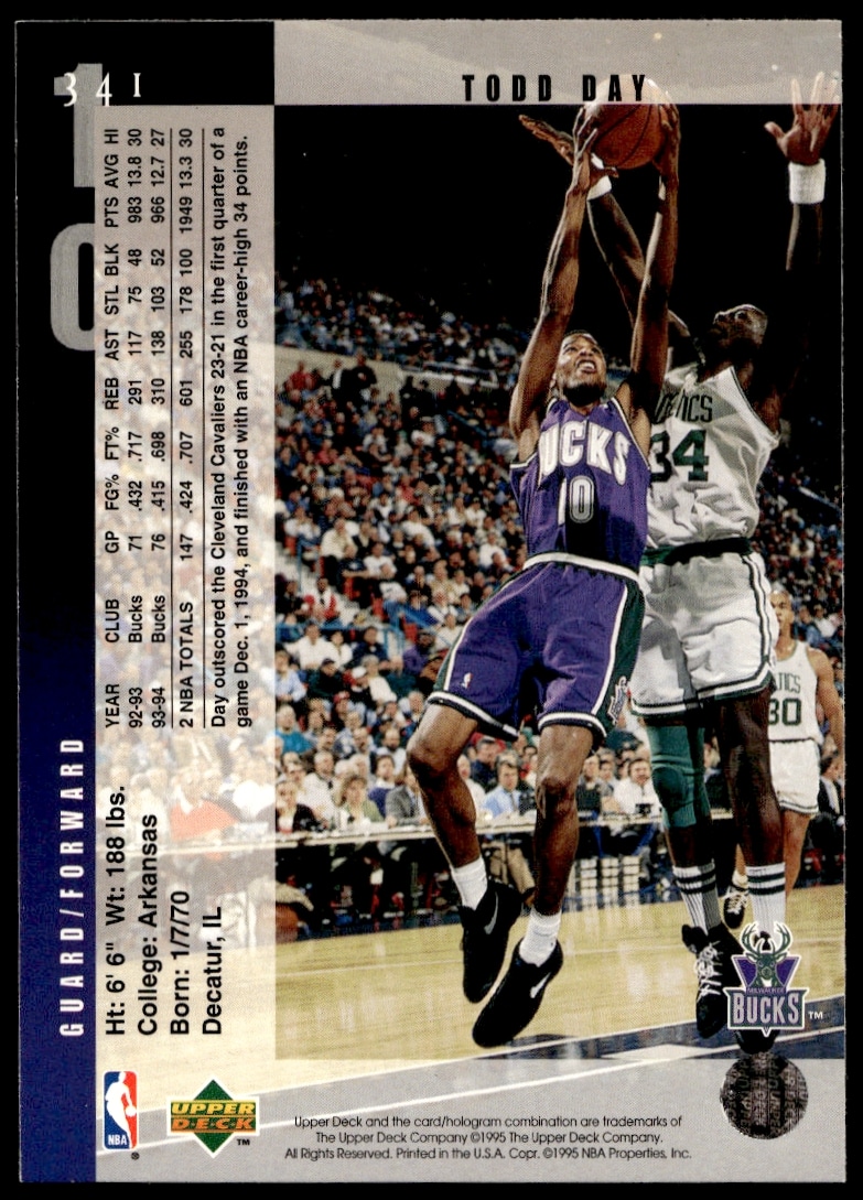 This Basketball card, from 1994-95 is part of the Upper Deck card set. Todd Day is featured and has a card number of 341.