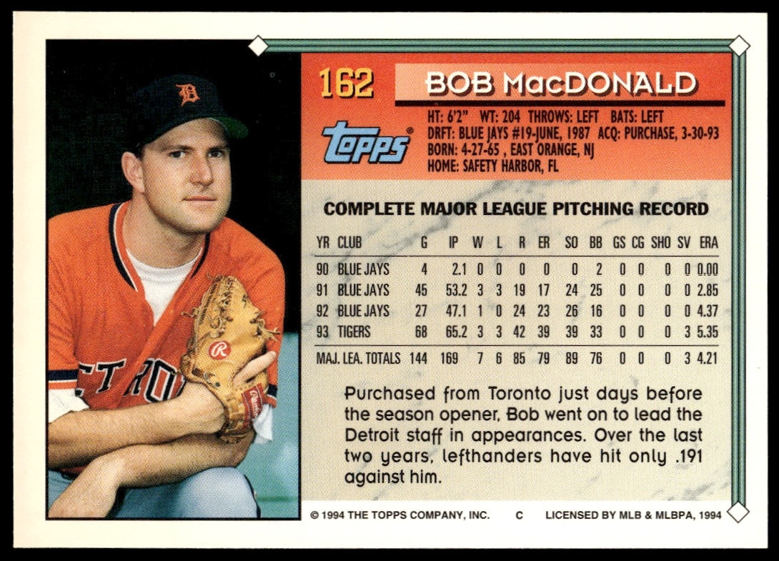 This BaseballΒ card, from 1994 is part of the Topps GoldΒ card set. Bob MacDonald is featured and has a card number of 162.