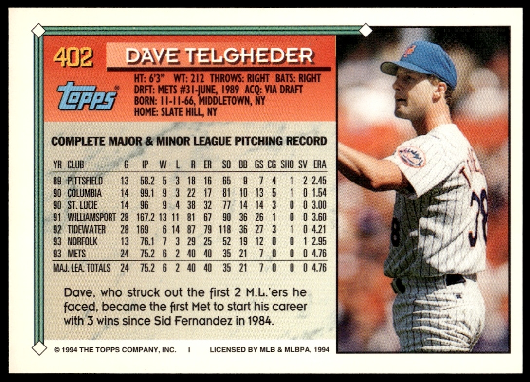 This Baseball card, from 1994 is part of the Topps Gold card set. Dave Telgheder is featured and has a card number of 402.